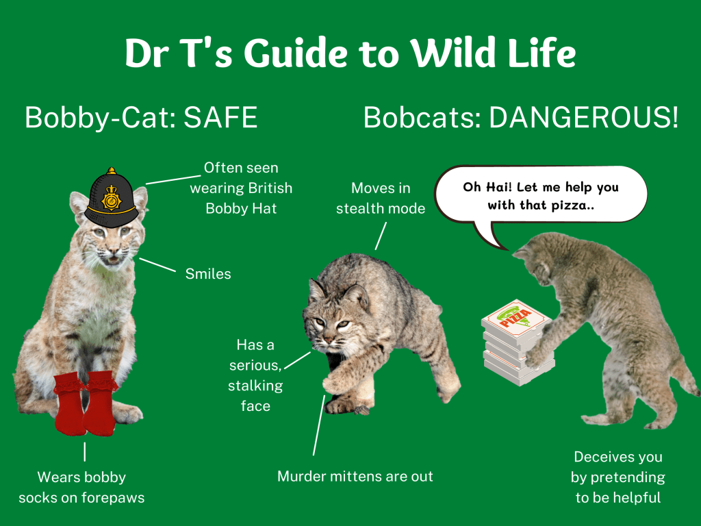 It is very important to be able to distinguish between the acceptable beasts and the ones that view you as prey. Before you head out into the wild, you should make sure that you review the creatures known to frequent your planned destination, and how to distinguish between the acceptable floofs and the dangerous floofs. For example, you should be able to tell the difference between a bobby-cat and a bobcat. You do not want to get these two mixed up!
